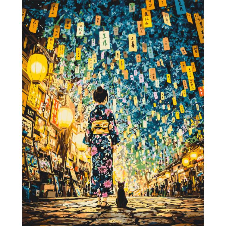 Картина за номерами: Японська ніч. Дівчина з котом , LW3515